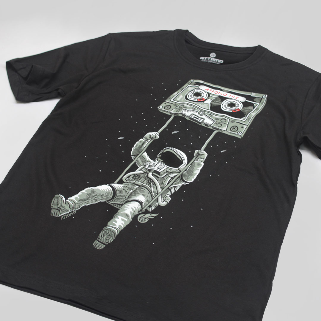 Lleva el arte en tu ropa. Esta camiseta negra con un fit cómodo destaca por su estampado de alta calidad que fusiona lo retro musical con el tema espacial. El diseño es un excelente iniciador de conversación y perfecto para un look casual con personalidad.