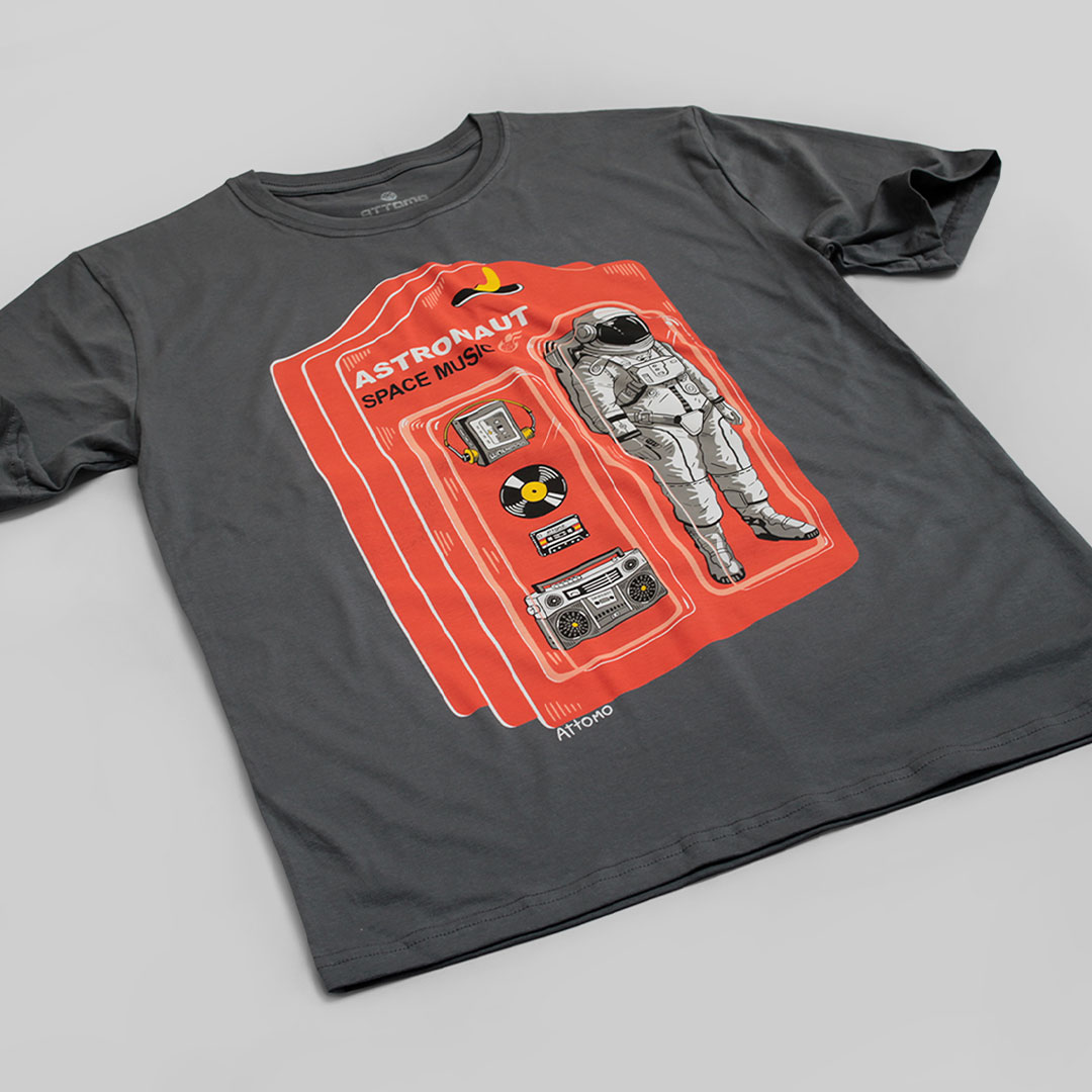 Lleva un souvenir del espacio. Esta camiseta gris carbón de fit cómodo destaca por su estampado que imita un empaque de burbuja (blíster) con un astronauta y equipos de audio. Un diseño original que combina la cultura pop y la aventura espacial. Estilo urbano garantizado.